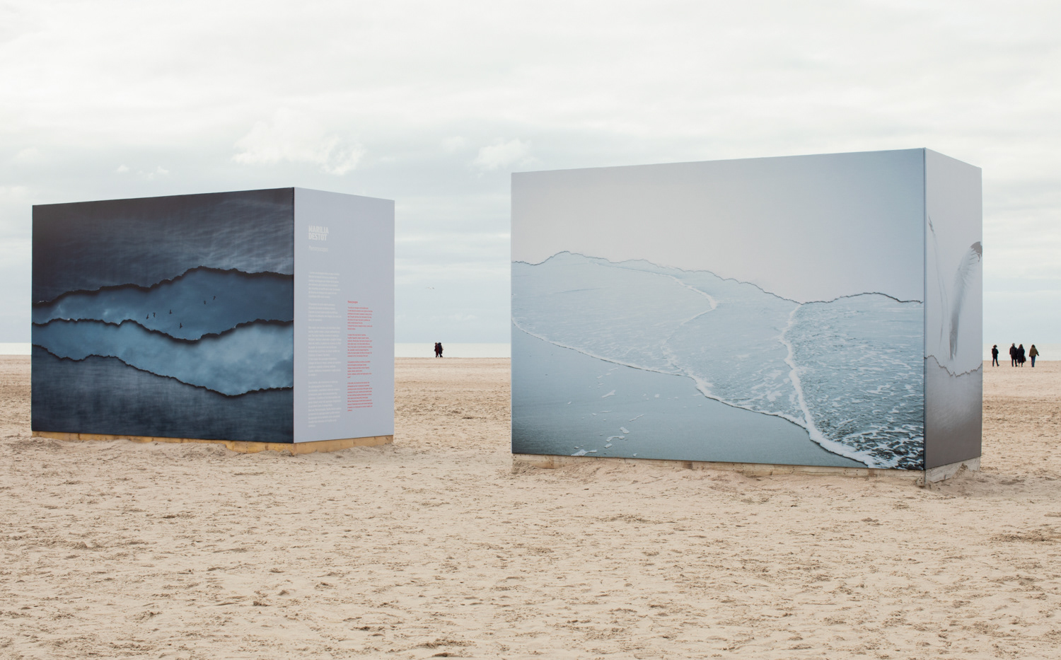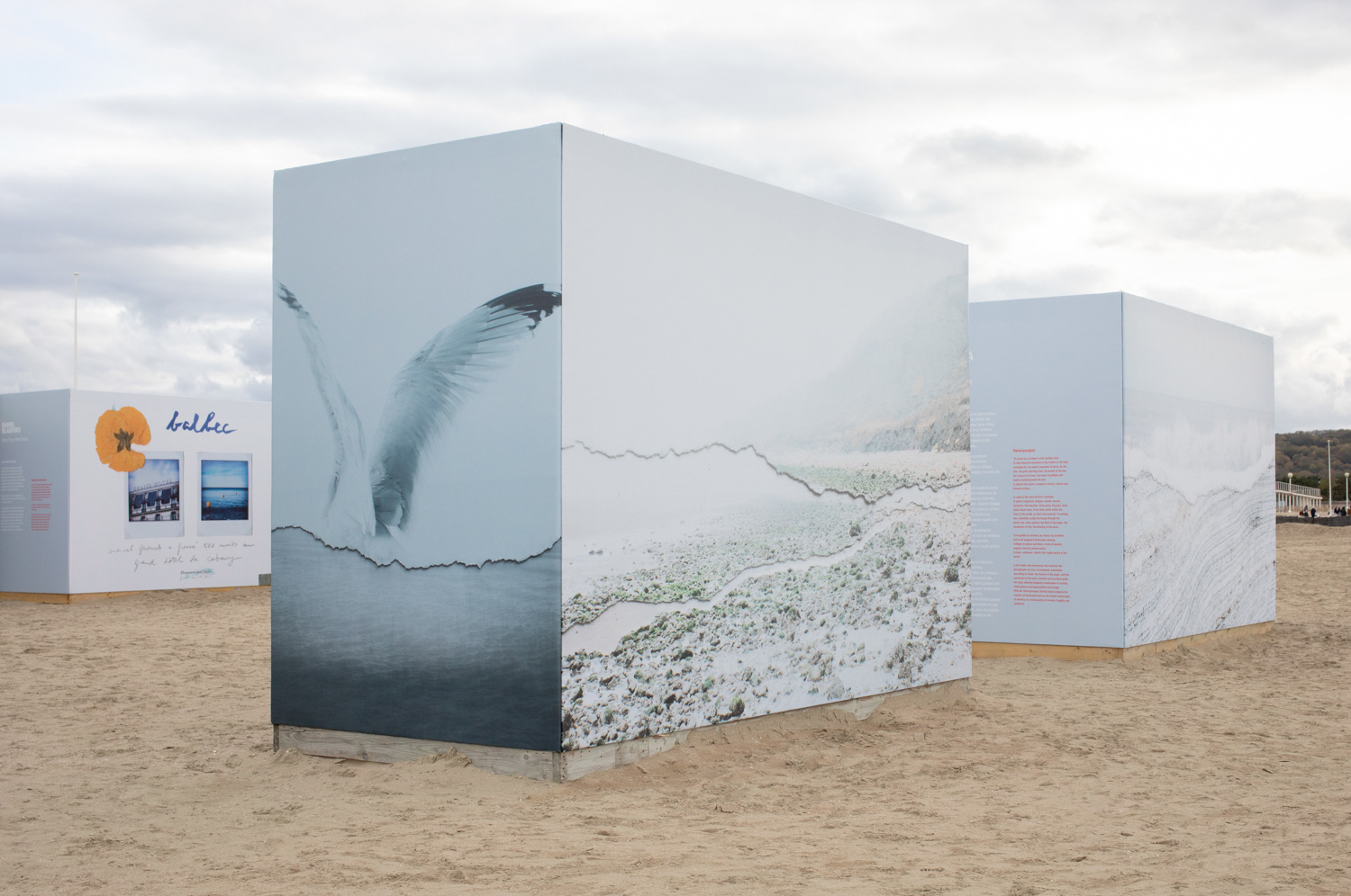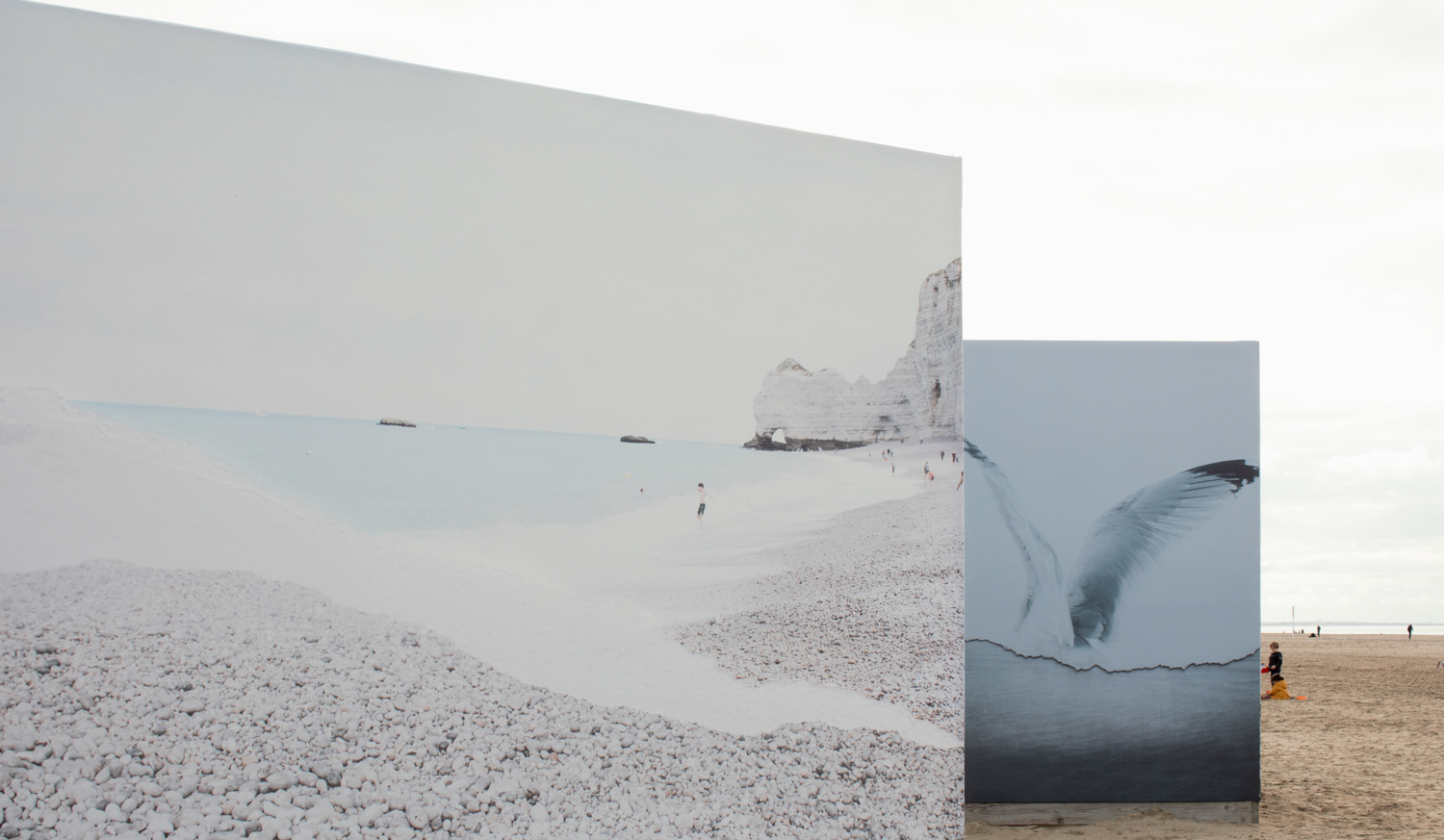 The exhibition on the beach shows large scale reproductions of the original collages, printed by Initial Labo, France.